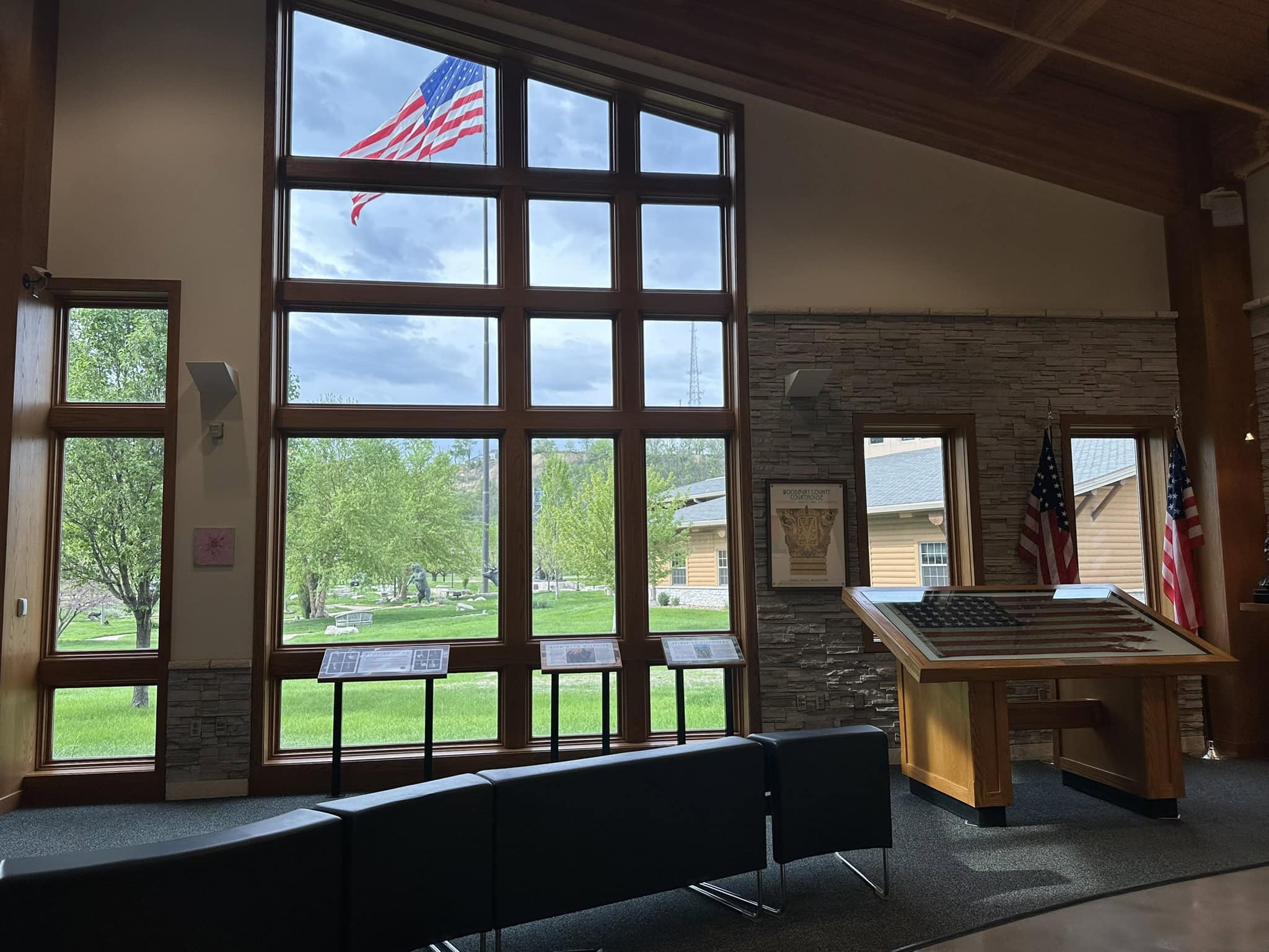 This space is beautiful inside and out. Don’t forget a picture with Lewis, Clark & Seamus out front! Also, take a moment to sit and look out through the tall glass windows that overlook a manicured lawn with bronze sculptures, set against the backdrop of the Missouri River. So peaceful!